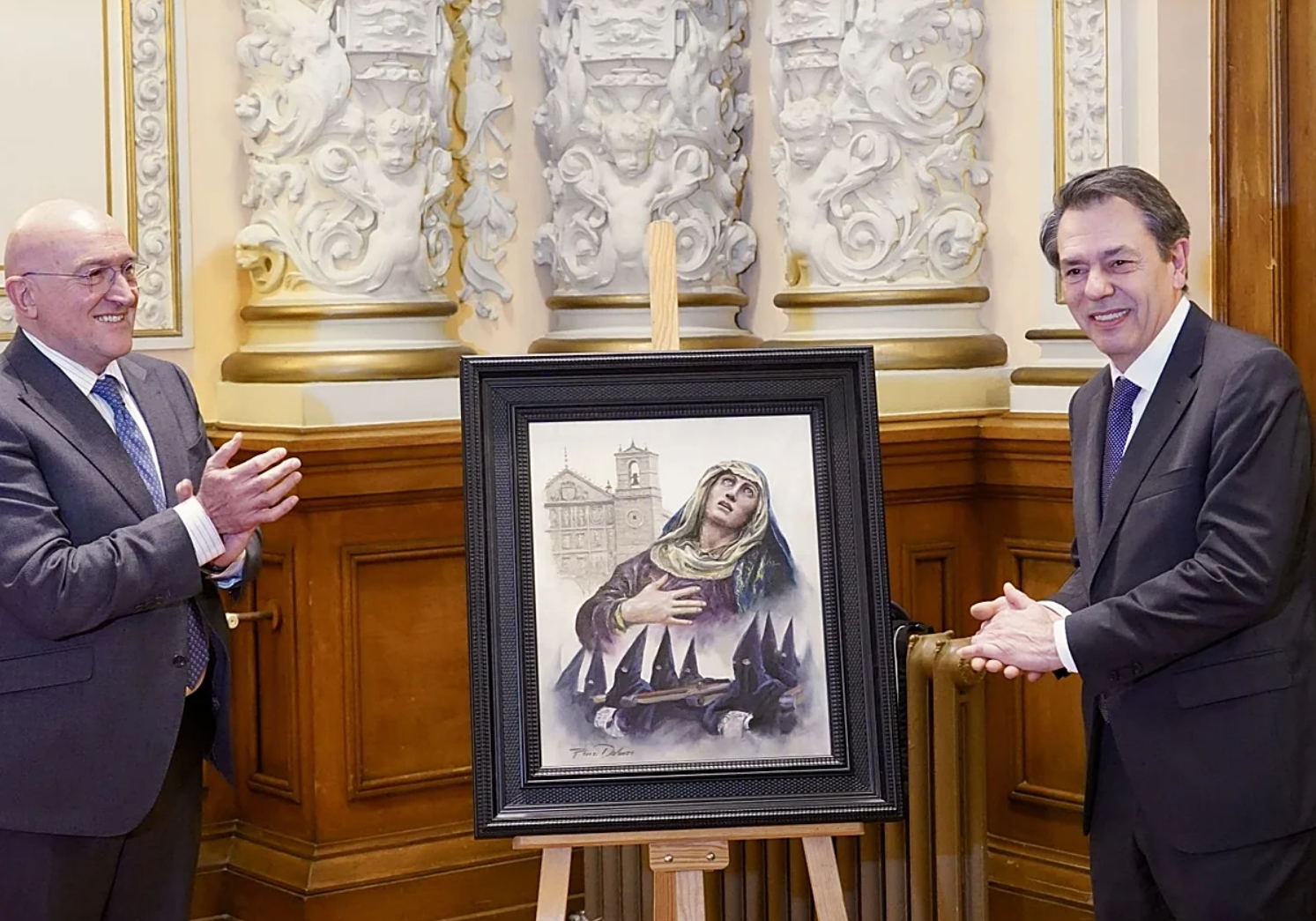 Jesús Julio Carnero se ha referido al autor del cartel como «un artista único, exclusivo y minucioso», cuyo trabajo «perdurará a lo largo de la historia». Sobre la obra, que une tradición y patrimonio -tiene a la Virgen de las Angustias como protagonista en un primer plano, con el fondo de la Iglesia de San Pablo y, en la parte inferior, cofrades de la penitencial- ha dicho que contiene los cuatro grandes elementos de la Semana Santa: la trama urbana con la iglesia de San Pablo; la imaginería castellana, con la citada obra de Juan de Juni, y los cofrades. «Hay un cuarto elemento que parece no aparecer, pero que está, que somo el público y los ciudadanos convertidos en cofrades de acera que forman parte del cuadro cuando interactuamos con él».