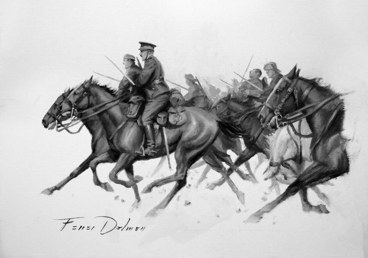 La exposición está formada por 25 bocetos que recorren grandes eventos de la historia de España. Desde la construcción de un galeón en dique seco, hasta la Guerra Civil o los combates de la División Azul en la Unión Soviética. Todo ello, sin obviar los caballos, el mascarón de proa del pintor de batallas desde hace décadas. «Son inéditas, aunque muchas sonarán a sus seguidores. Y tiene sentido. Cuando plantea un cuadro, dibuja una infinidad de figuras para la composición. Las que no tienen cabida en los lienzos, las termina al óleo, ya sea en color o en blanco y negro», sentencia Fidalgo.