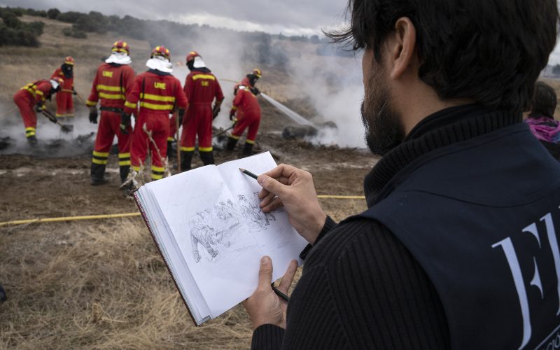 Ataviados con sus cuadernos, a vuela pluma y en menos de treinta minutos se adentraron entre barrancos, fuegos hipnóticos o las aguas del río Tajo para retratar a la Unidad Militar de Emergencias (UME)en el campo de maniobras de los Alijares (Toledo). Allí, se entrenaban los militares en curso básico de emergencias en el rescate vertical, el traslado de heridos con camilla y paso de tirolina, en la lucha contra incendios o en El Arroyo de la Degollada donde les instruían en las formas de evadir a las aguas embravecidas, a saber salir a contra corriente, a acceder a una víctima o colocar la «línea de vida». También los estudiantes del master de la Fundación Arte e Historia Ferrer-Dalmau que imparte la universidad de Nebrija entrenaron en la toma de bocetos como retratistas de la memoria, bajo la dirección del pintor de batallas Augusto Ferrer-Dalmau.