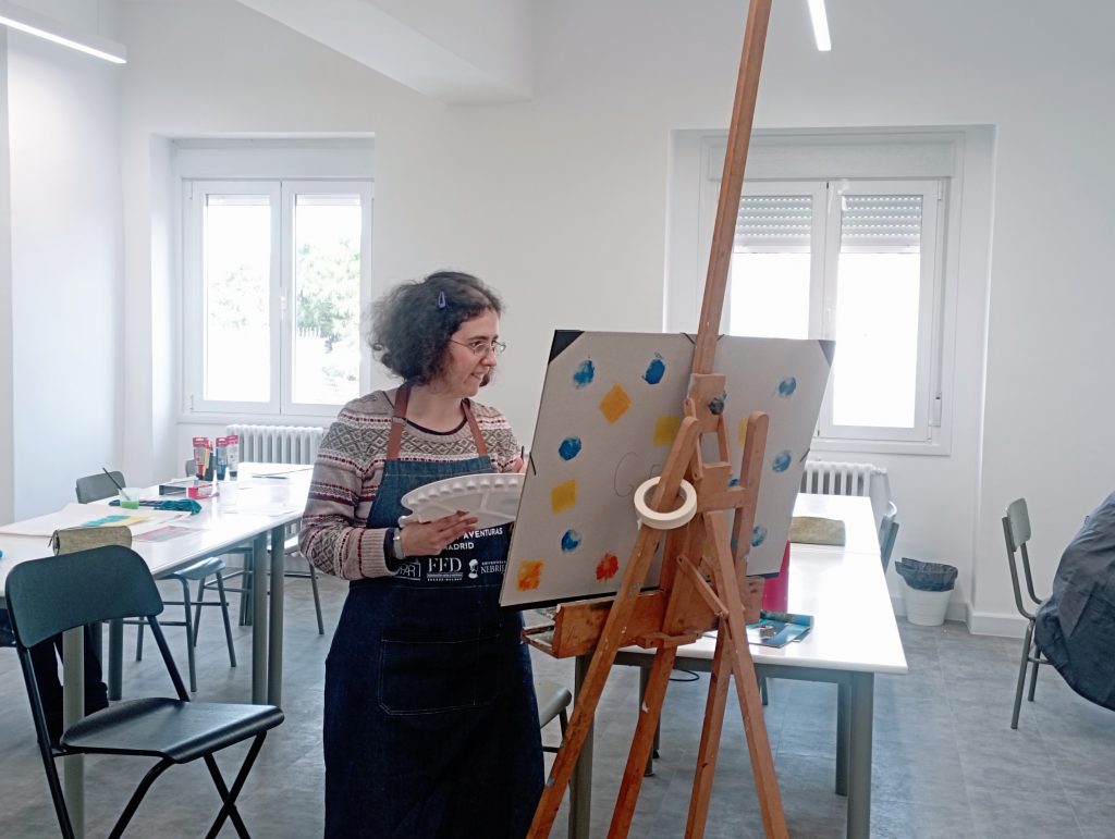 El taller es amplio: aula diáfana dotada de buena luz natural y una iluminación ambiental clara que ensalza el espacio. En ella se distribuyen mesas blancas y grandes sobre las que se disponen/desparraman láminas, pinceles, pinturas y paletas: las herramientas del día a día de los estudiantes del “Taller de Arte y Aventuras por Madrid” que acoge la Fundación A LA PAR.