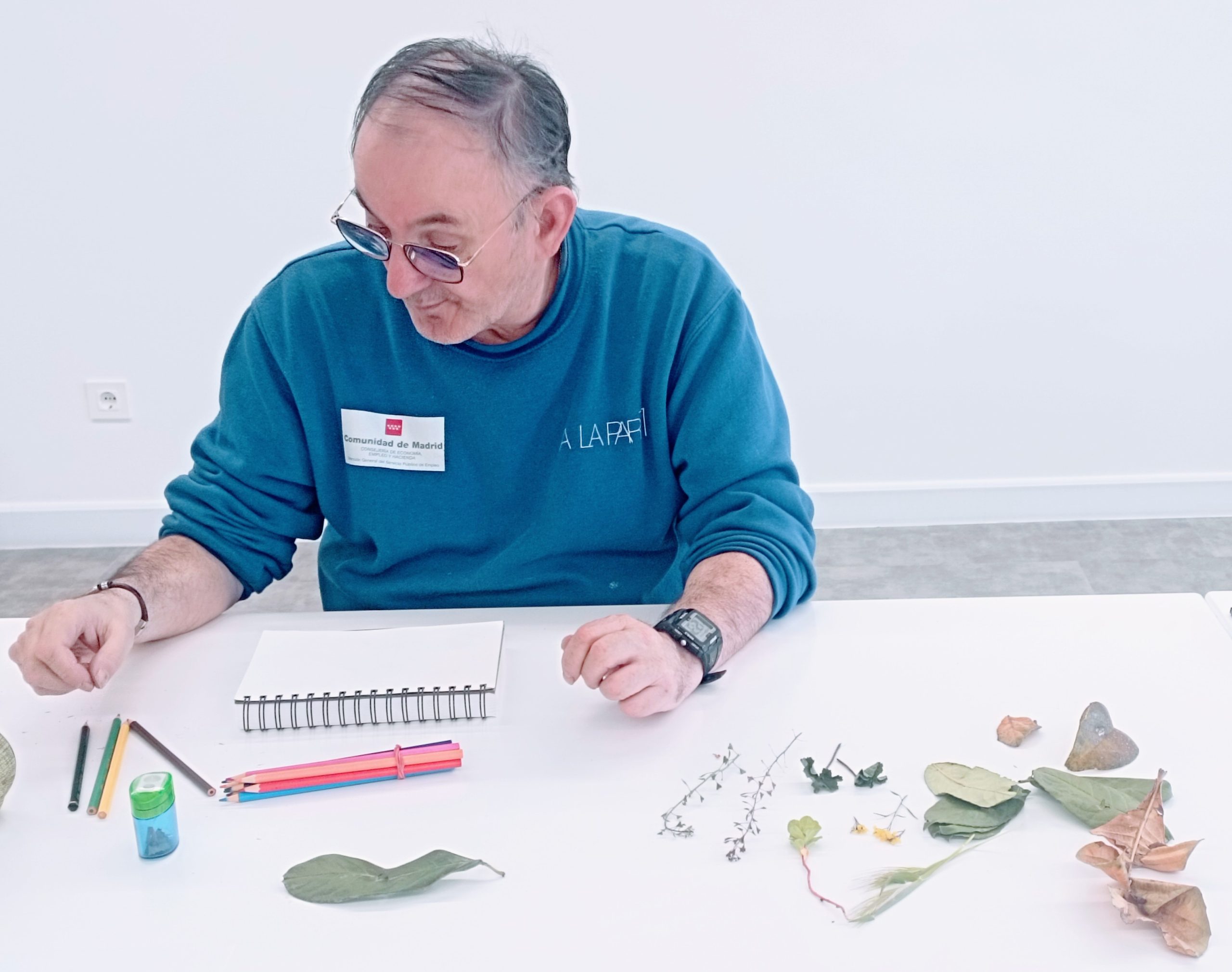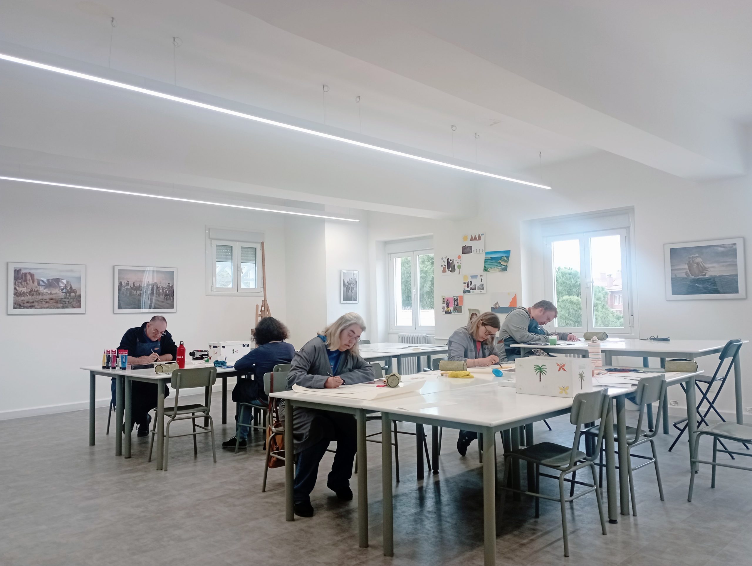 El taller es amplio: aula diáfana dotada de buena luz natural y una iluminación ambiental clara que ensalza el espacio. En ella se distribuyen mesas blancas y grandes sobre las que se disponen/desparraman láminas, pinceles, pinturas y paletas: las herramientas del día a día de los estudiantes del “Taller de Arte y Aventuras por Madrid” que acoge la Fundación A LA PAR.