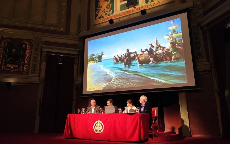 La conferencia hizo un recorrido por los últimos 500 años de la historia de España comenzando con el Descubrimiento de América por Cristóbal Colón en 1492, ilustrado por “La Primera Playa” una de la últimas las obras de Pintor de Batallas en el que se muestra el desembarco que aquellos pioneros navegantes hicieran en la la playa de Guanahani el 12 de octubre de 1492. El recorrido histórico paso por la Vuelta al Mundo que completaría Juan Sebastián Elcano, la Primera Globalización del Planeta y el mestizaje características de la Monarquía Hispánica.